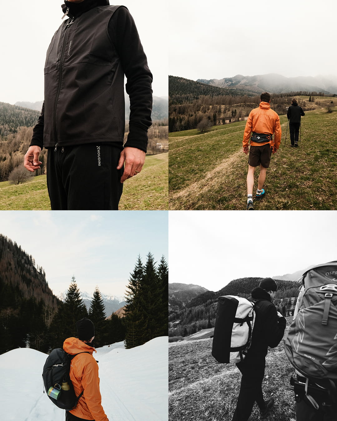 During the day trip that takes place at a slightly lower altitude where the snow is absent but the threat of rain remains, we replace the mid-layer with a tencel t-shirt and a pair of lightweight shorts that increase flexibility and are more adapted to a higher pace and more “worked-up” warmth.
