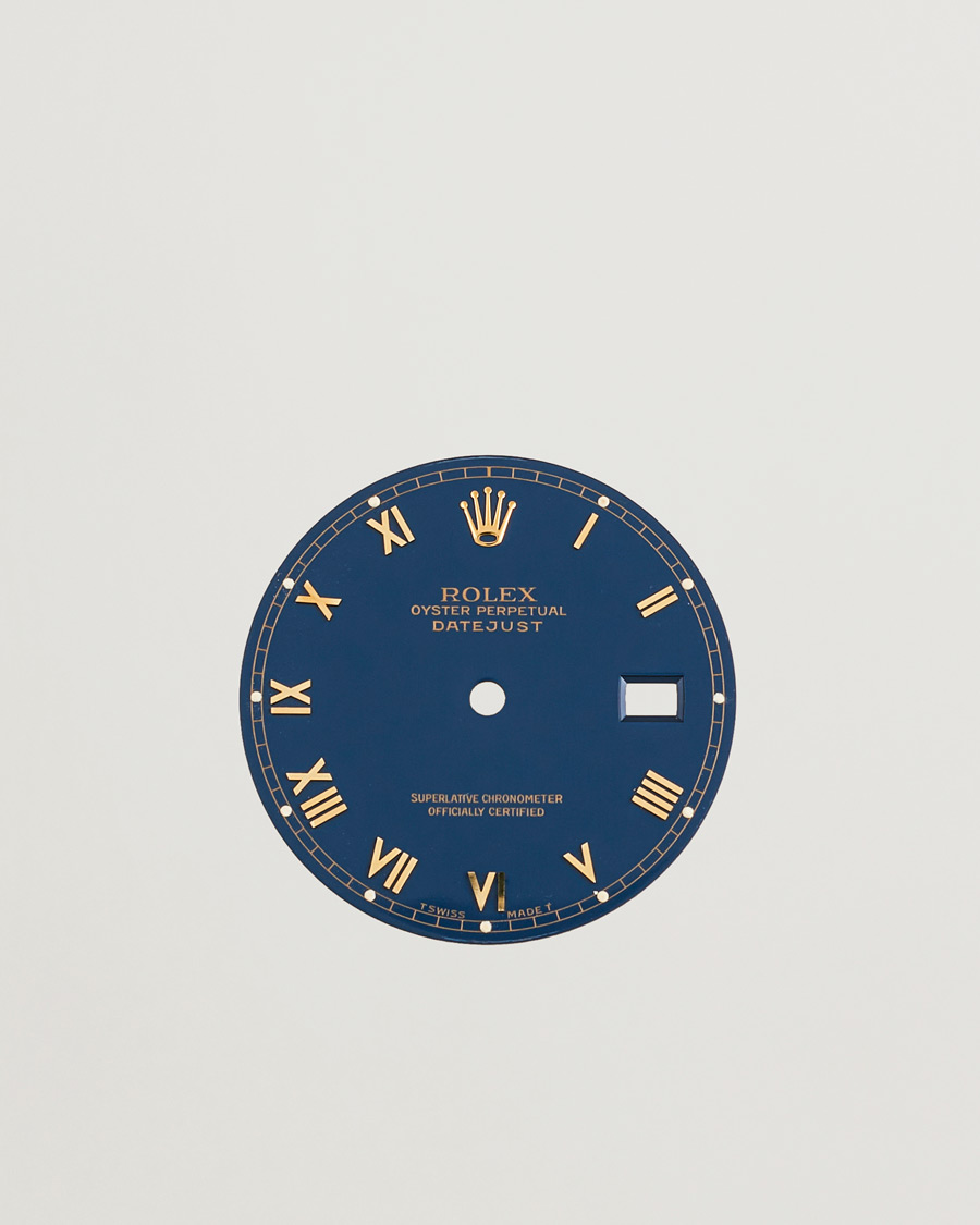 Original Rolex-Zifferblatt für das Modell Datejust in 36 mm, angepasst für fünf- und sechsstellige Referenzen. Blaue Platte mit römischen Ziffern in Goldton. Ein farbenfrohes Design, das der Uhr einen unverwechselbaren und klassischen Look verleiht.